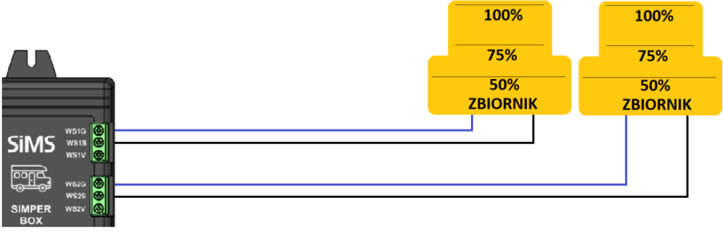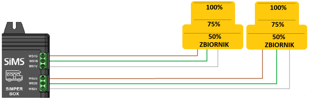 - Für Stufe 2 Sensor (z. B. Grauwasser): Machen Sie dasselbe und verwenden Sie die WS2G-, WS2S- und WS2V-Anschlüsse an der SiMPER BOX.